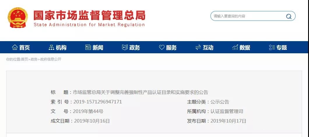 10月17日,市場監(jiān)管總局發(fā)布關于調(diào)整完善強制性產(chǎn)品認證目錄和實施要求的公告,對強制性產(chǎn)品認證目錄和實施要求進行了調(diào)整: