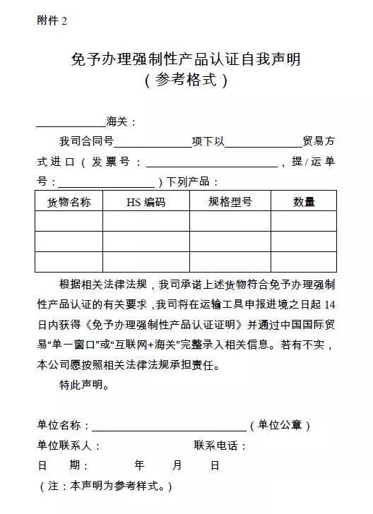 一、對于符合免予辦理強制性產(chǎn)品認(rèn)證的進口汽車零部件(HS編碼范圍見附件1),報關(guān)單位可憑收貨人自行出具的《免予辦理強制性產(chǎn)品認(rèn)證自我聲明》(以下簡稱《自我聲明》,參考格式見附件2),按《免予辦理強制性產(chǎn)品認(rèn)證進口汽車零部件申報指南》(附件3)要求辦理申報手續(xù)后,即可將貨物提離口岸。