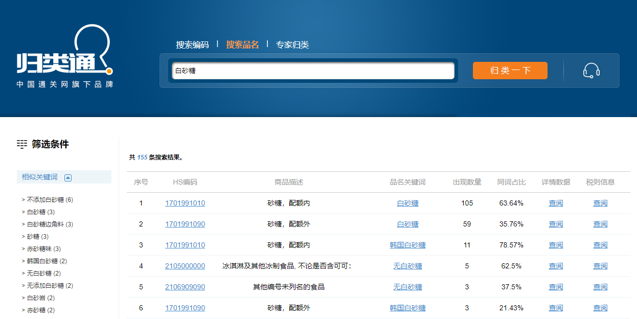 例如搜索白砂糖,就會(huì)出現(xiàn)HS編碼,海關(guān)稅金,一般都是根據(jù)百分比計(jì)算,按貨值*百分比即可確認(rèn)到不同產(chǎn)品的稅金。