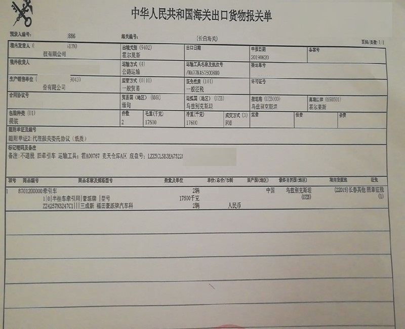 汽車(chē)出口報(bào)關(guān)。2019年06月20日協(xié)助汽車(chē)外貿(mào)公司從霍爾果斯口岸出口汽車(chē)到烏茲別克斯坦,當(dāng)天通關(guān)審結(jié),為汽車(chē)貿(mào)易出口通關(guān)提供了大大的便利! 天津報(bào)關(guān)行 代理報(bào)關(guān) 代理報(bào)檢 貨運(yùn)